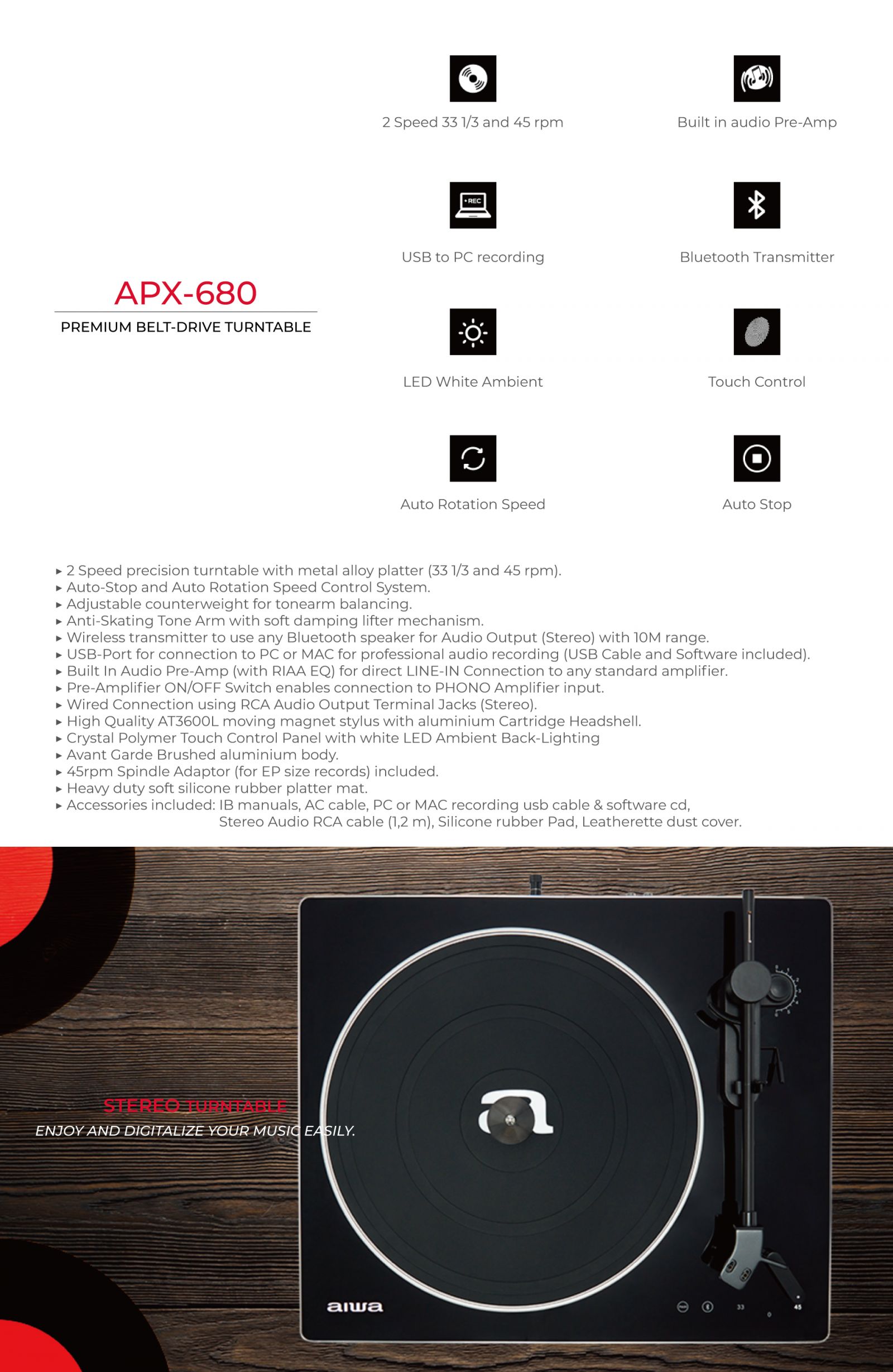 2 Speed precision turntable with metal alloy platter (33 1/3 and 45 rpm).