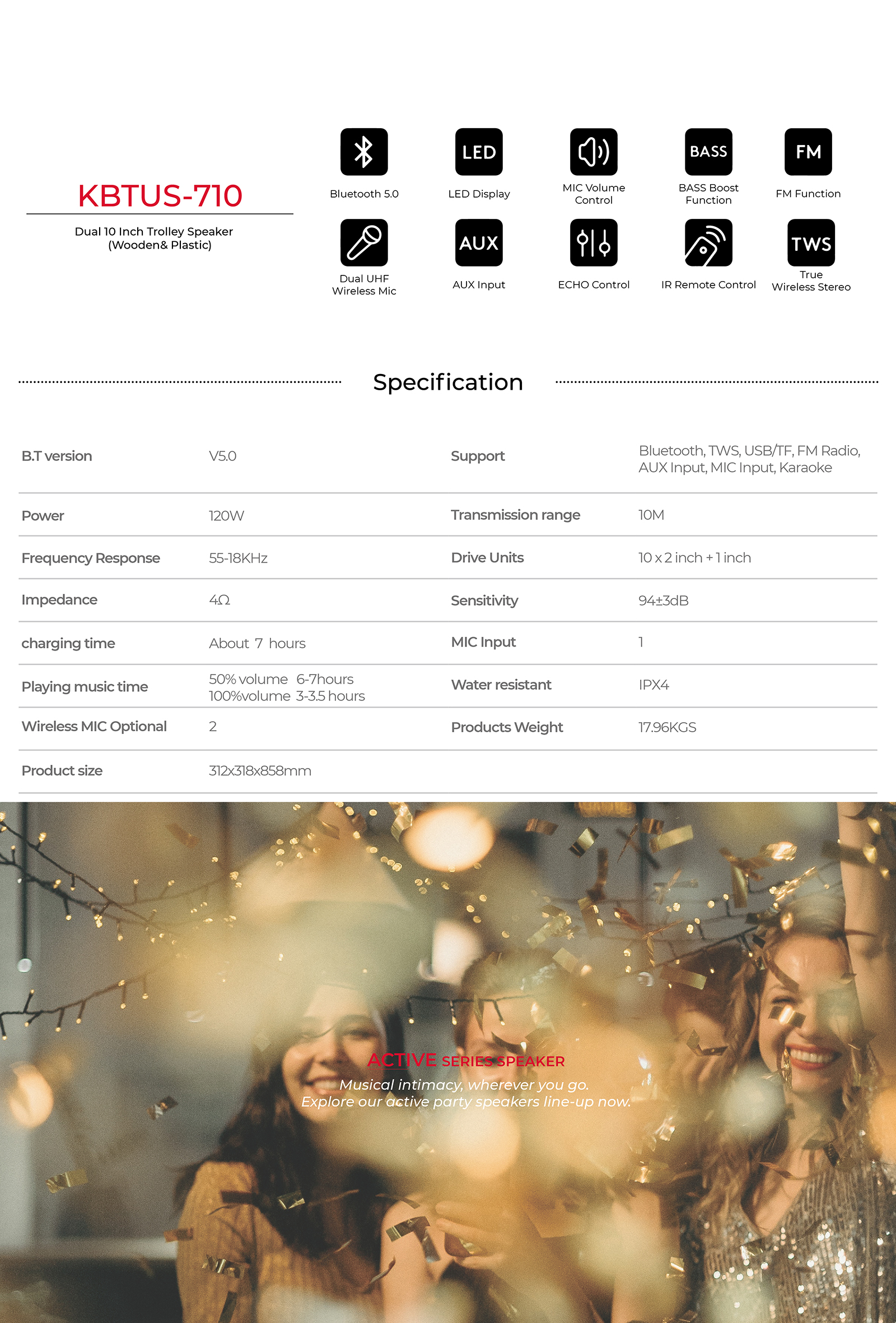 Bluetooth, TWS, USB/TF, FM Radio, AUX Input, MIC Input, Karaoke