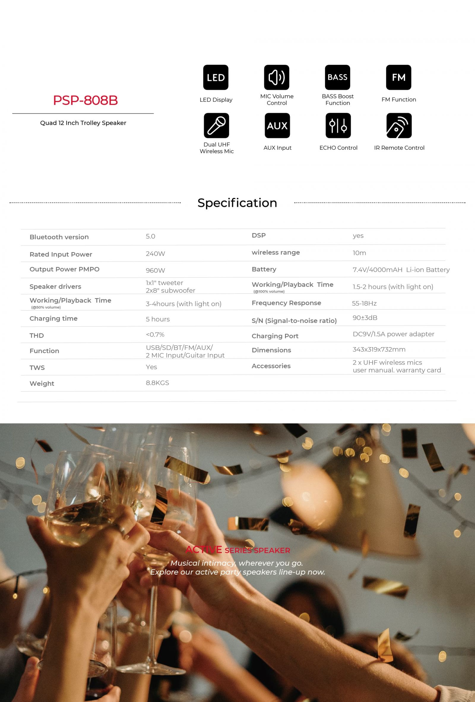 Bluetooth, TWS, USB/TF, FM Radio, Optlcal &Coaxial Input, AUX Input, MIC Input, Karaoke